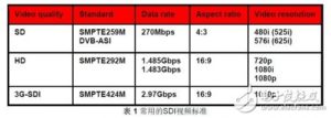 SDI,串行數(shù)字接口,是用來傳輸標(biāo)清、高清、3G 高清等無壓縮數(shù)字視頻信號的一個標(biāo)準(zhǔn),當(dāng)前最流行的SDI視頻格式如表1所示。由于SDI具有高清特性,時延小,還可以重復(fù)利用已布網(wǎng)的模擬視頻電纜等優(yōu)勢,正逐漸地被安防、監(jiān)控等領(lǐng)域廣泛采用。目前市面上SDI相關(guān)設(shè)備主要是SDI延長器、分配器、矩陣、多畫面分割、編解碼器、SDI光端機、DVR等。
