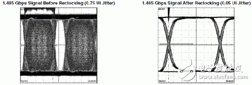 SDI 重定時器是用來自動檢測輸入信號類型,調(diào)整自身的PLL和CDR電路而恢復(fù)和整形出低抖動的時鐘,再重新定時發(fā)送出接收到的SDI信號,以降低SDI信號的抖動。雖然均衡器也可以降低SDI信號的抖動,但它和重定時器是兩種完全不同的器件,兩者不可相互替代。均衡器的作用是通過增加高頻增益使傳輸通道頻率響應(yīng)趨于平坦來改善眼圖和信號抖動,而重定時器則是通過PLL和CDR來抑制和降低累加噪聲。如果SDI傳輸通道很長或者傳輸過程中被其他噪聲和干擾惡化,僅有均衡器還不足以改善信號的質(zhì)量,此時在均衡器輸出端再串接一個重定時器是一個理想的提高SDI信號質(zhì)量的方案。圖5描述了重定時器的去抖效果,可見眼圖和抖動被明顯改善。