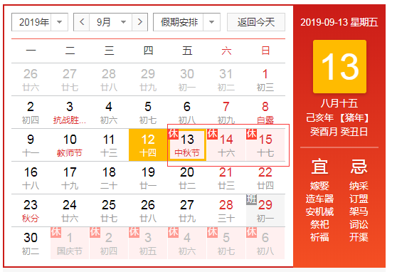根據(jù)國(guó)家相關(guān)部門關(guān)于2019年中秋節(jié)放假規(guī)定,結(jié)合我公司實(shí)際情況,現(xiàn)將2019年中秋節(jié)放假相關(guān)事項(xiàng)安排如下:我公司于2019年9月13日至2019年9月15日放假,共計(jì)3天。9月16日正常上班。