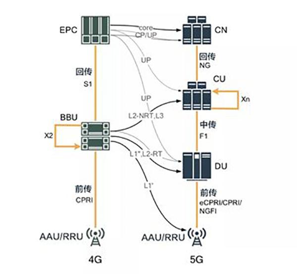 與4G基站的BBU+RRU構(gòu)架不一樣,5G基站被重構(gòu)為三部分:CU(中央單元)、DU(分布式單元)和AAU/RRU(遠端射頻單元)。RRU/AAU與DU之間的網(wǎng)絡(luò)稱為前傳,CU和DU兩者之間稱之為中傳,而CU到核心網(wǎng)兩者之間稱之為回傳。那樣的架構(gòu)設(shè)計還可以更強的推動RAN虛擬化技術(shù),還可降低前傳帶寬,同時滿足低時延需求。