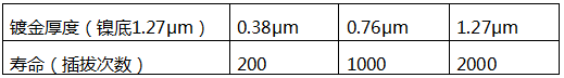 鍍層厚度直接影響連接器的壽命,行業(yè)內(nèi)有開展相關(guān)的插拔試驗,論證鍍層厚度和壽命關(guān)系。某試驗數(shù)據(jù)采用的是直徑為0.635 cm的端子,摩擦距離1.27 cm,正向力100g每個循環(huán)。