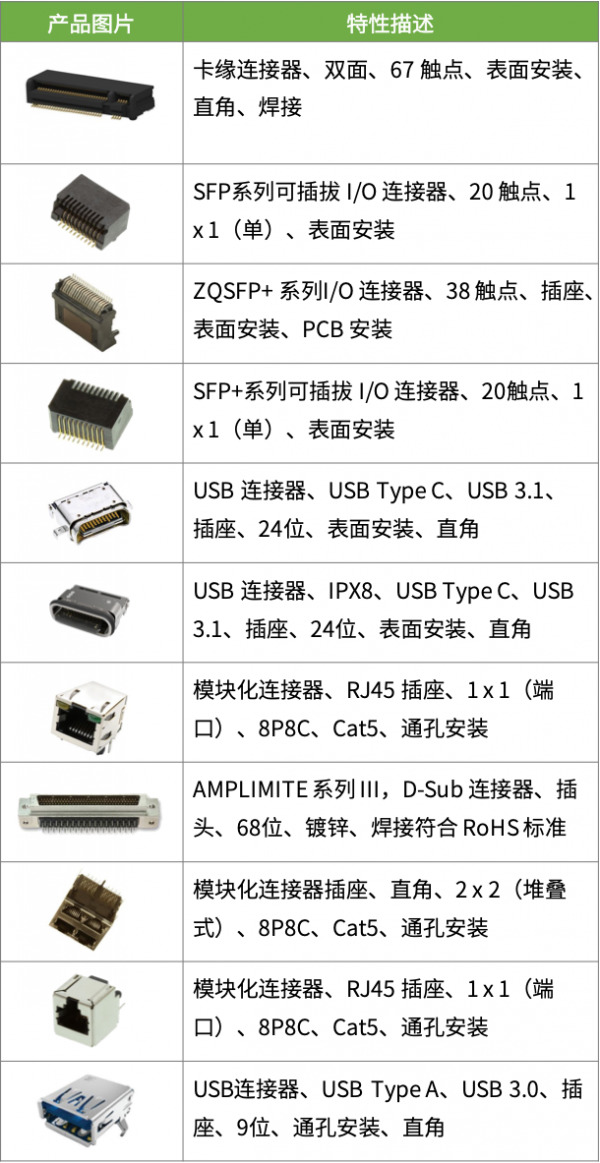 TE廣泛的I/O互連產(chǎn)品既有高速、高密度的I/O可插拔連接器,也有傳統(tǒng)的D-Sub和模塊化插座連接器,可以滿足從高速數(shù)據(jù)傳輸?shù)侥陀玫墓I(yè)通信等不同市場的需求,讓你在應(yīng)對數(shù)據(jù)速率和空間尺寸的挑戰(zhàn)時(shí)游刃有余。代表產(chǎn)品包括: