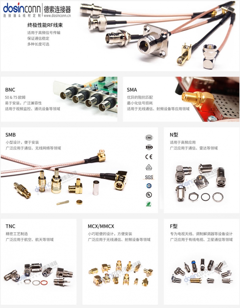 德索精密工業(yè)主營產(chǎn)品包括高速數(shù)據(jù)傳輸連接器、工業(yè)圓形連接器、矩形連接器、RF射頻同軸連接器、車載連接器以及新能源連接器等,廣泛應用于通信、安防監(jiān)控、汽車、醫(yī)療、航空、工防等多個領域,以滿足不同行業(yè)對高性能連接器的需求。采購電話:400-6263-698,歡迎前來下單。