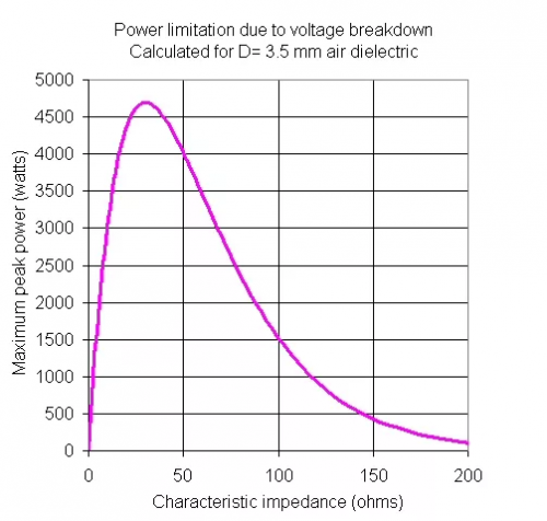 Before we move on to average power handling of coax, let’s look at power handing as a function of line impedance for air coax, which is part of the “coax compromise” that led to the fifty ohm standard. If you allow the center diameter freedom to move away from 50 ohms, you’ll see that maximum peak power handling occurs at ~30 ohms.