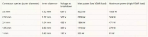 Now let’s look at some coax examples… how about the air dielectric 50-ohm connectors? The breakdown strength of air 3,300,000 volts/meter according to Wikipedia, but that is at “dry air” at standard temperature and pressure, between spherical electrodes. Let’s use 1,000,000 volts/meter.