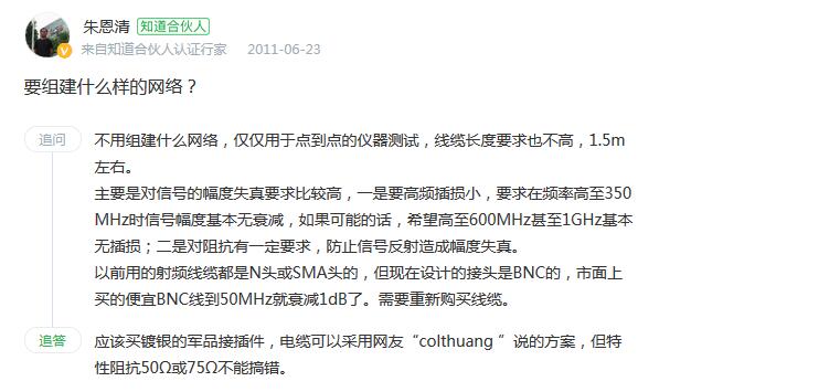 不用組建什么網(wǎng)絡(luò),僅僅用于點(diǎn)到點(diǎn)的儀器測試,線纜長度要求也不高,1.5m左右。主要是對信號的幅度失真要求比較高,一是要高頻插損小,要求在頻率高至350MHz時信號幅度基本無衰減,如果可能的話,希望高至600MHz甚至1GHz基本無插損;二是對阻抗有一定要求,防止信號反射造成幅度失真。以前用的射頻線纜都是N頭或SMA頭的,但現(xiàn)在設(shè)計(jì)的接頭是BNC的,市面上買的便宜BNC線到50MHz就衰減1dB了。需要重新購買線纜。