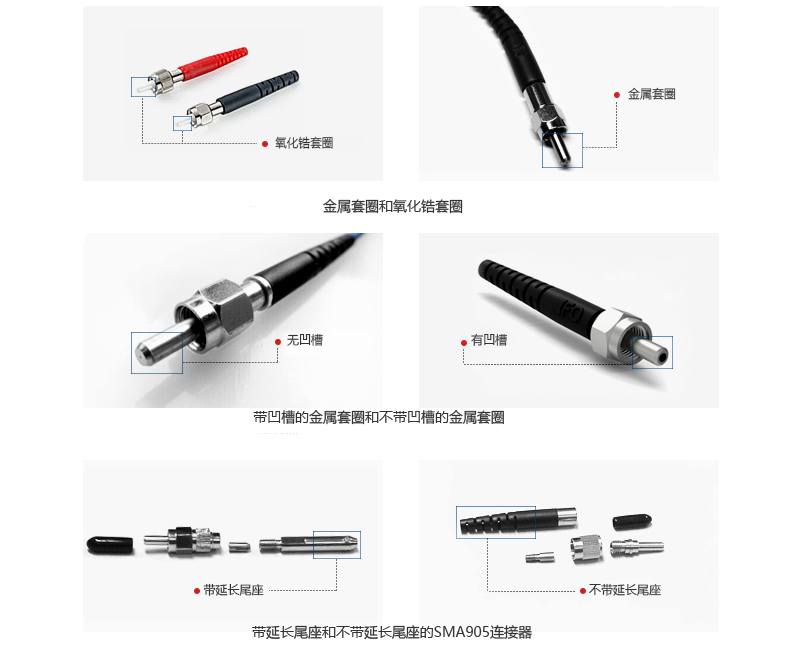 如下圖所示,SMA光纖跳線的連接器有帶金屬套圈(帶凹槽和不帶凹槽)、帶氧化鋯套圈和帶延長尾座這三種類型,它們的結(jié)構(gòu)各不相同,具體詳情如下: