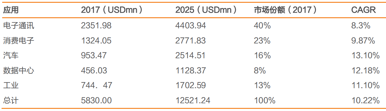 根據(jù)天風(fēng)證券的預(yù)測(cè),在5G等新興應(yīng)用的推動(dòng)下,2025年全球FPGA市場(chǎng)規(guī)模將達(dá)到125億美元左右,年復(fù)合增長(zhǎng)率為10.22%。其中電子通信應(yīng)用市場(chǎng)規(guī)模將達(dá)到44億美元左右。