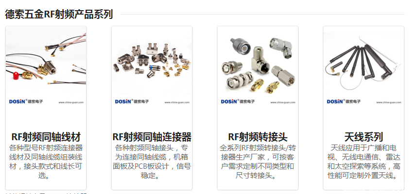 東莞德索五金電子2005年成立,專業(yè)研發(fā)、生產(chǎn)、銷售MICRO MINI BNC,BNC,BNC,TNC,N,UHF,MINI UHF,F(xiàn),PAL,RCA,SOLDERLESS,F(xiàn)ME,SMA,SMB,SSMB,SMZ(BT43),MCX,MMCX,1.6-5.6和1.0-2.3同軸系列,電纜組件。產(chǎn)品主要應(yīng)用于通信、安防監(jiān)控、汽車、醫(yī)療、航空、工防等領(lǐng)域,用以數(shù)據(jù)信號(hào)傳輸或電源供應(yīng)。