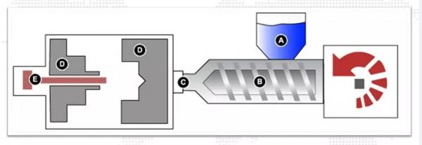 A 進(jìn)料機(jī)制: 塑料顆粒被裝進(jìn)漏斗