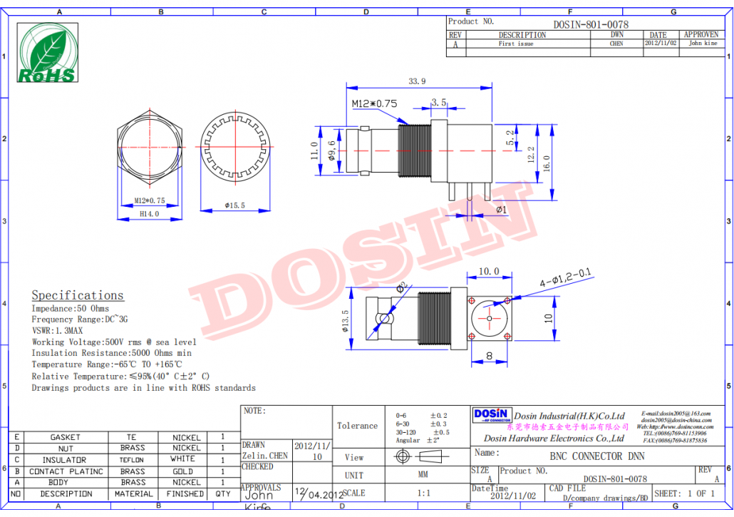 標簽:PCB板端,母頭,彎式,鋅合金,RF射頻同軸,BNC連接器,50歐姆,穿墻