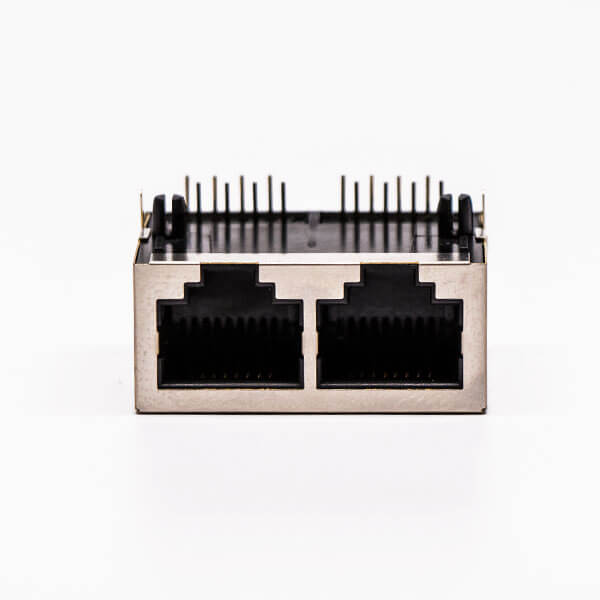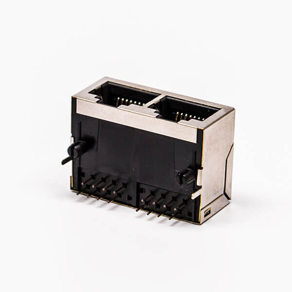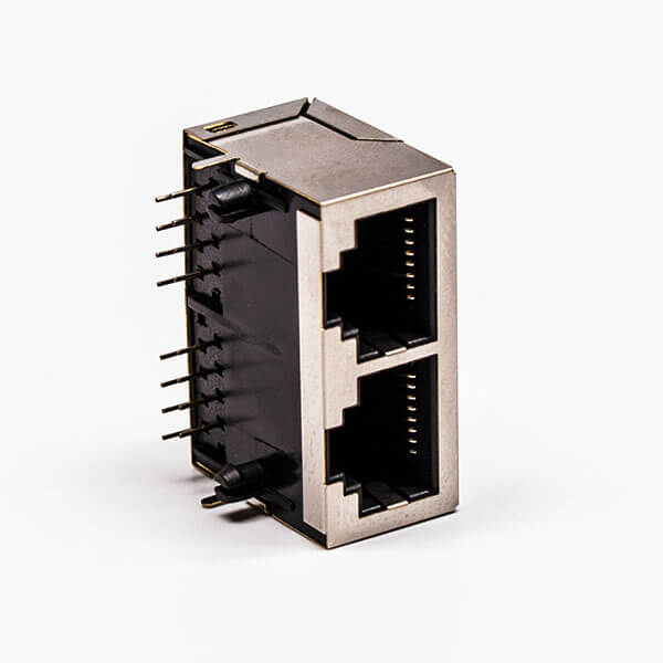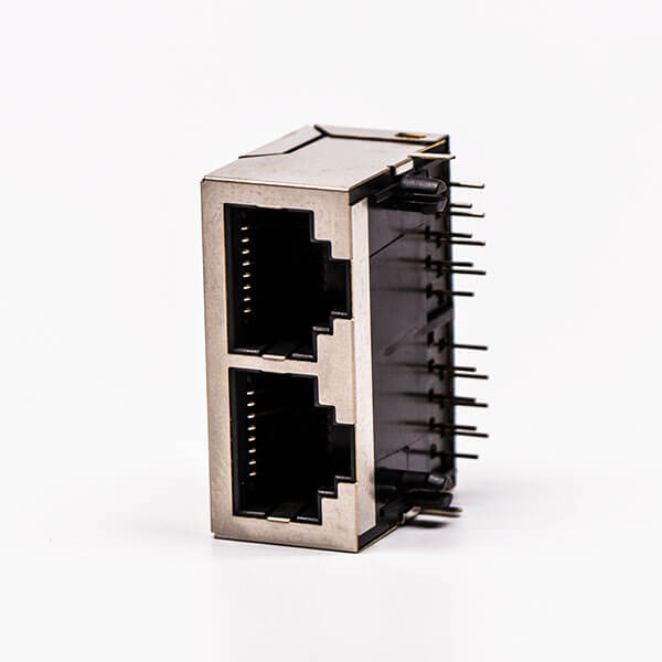 料號:DOSIN-819-0529 標簽:RJ45,母座,PCB板,8P,雙口,彎式,帶屏蔽,不帶燈,不帶彈片,銅殼