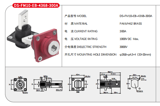 英文描述:Single Stud Type Junction Blocks, 300A, Internal Screw (M10), Busbar with M10,Flange Mounting, Black