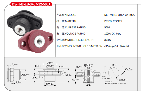 法蘭500A穿墻式接線柱內(nèi)螺紋M8黑色