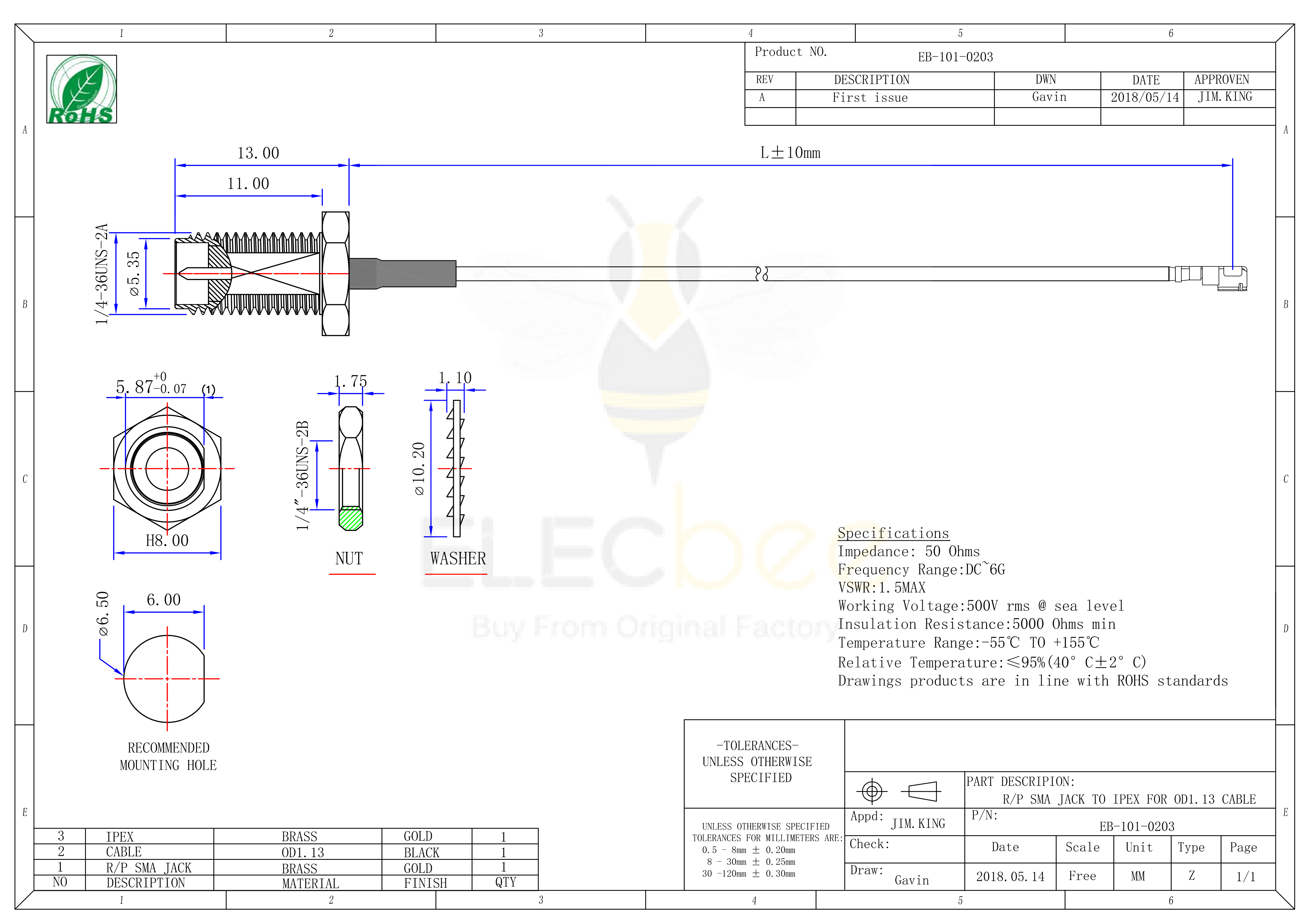 料號:EB-101-0203 標簽:RF線材,1.13同軸線纜,SMA直式連接器,IPEX彎式連接器,反極母轉(zhuǎn)母