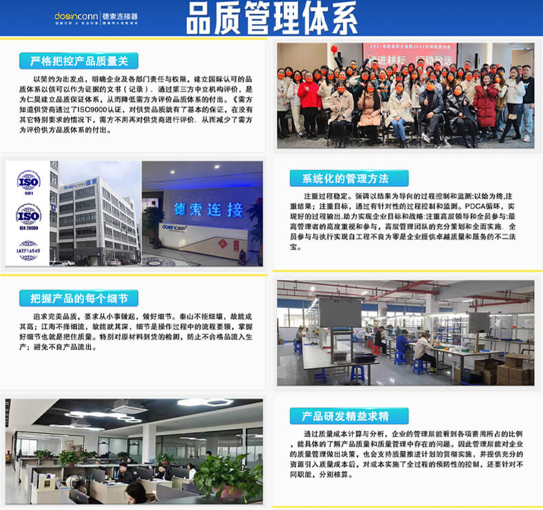 讀完上文之后,您對于“定制連接器模具用什么鋼材比較好”應(yīng)該非常清楚了,更多“定制連接器模具用什么鋼材比較好”相關(guān)的技術(shù)資料,德索運營團隊會繼續(xù)編輯整理發(fā)布在資訊頻道與您分享。?東莞市德索精密工業(yè)有限公司是一家專業(yè)精密連接器模具生產(chǎn)制造企業(yè),專業(yè)性強,長期為國內(nèi)外知名企業(yè)服務(wù),深受海內(nèi)外客戶的高度信賴!擁有占地 20000 平方的自有工廠,配備了 30 條現(xiàn)代化生產(chǎn)線以及大量的射出成型機、精密沖床、端子壓鑄機、注塑機等先進設(shè)備,具備強大的開模定制能力,可根據(jù)客戶要求對連接器的尺寸、樣式、材料性能、線材長度等進行修改,產(chǎn)品通過了多項質(zhì)量管理體系認證和環(huán)境管理體認證,質(zhì)量有保障。