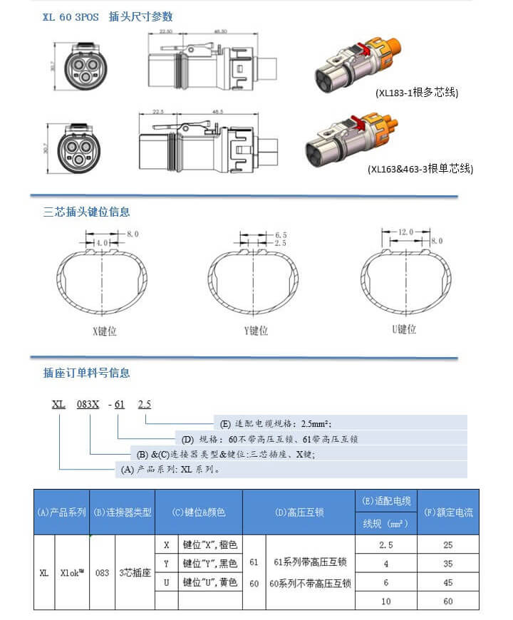 如果您覺得XL60 3芯系列,無法滿足您的需求,可以咨詢我們的工防師,讓他們根據(jù)您的需求推薦適合您的產(chǎn)品。XL60 3芯系列產(chǎn)品,可選電流分別是25A,35A,45A,60A,可選直式,可選擇帶不帶互鎖功能。